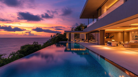 Luxurious tropical villa interior with ocean view at dusk