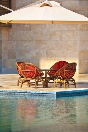 four chairs and table near a swimming pool
