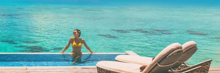 Vacation panoramic of luxury resort woman relaxing in infinity swimming pool of private hotel room overwater villa banner. Bikini tourist sunbathing in bikini.
