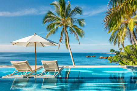 Luxury beach resort swimming pool, palm trees, seaside vacation, summer travel destination