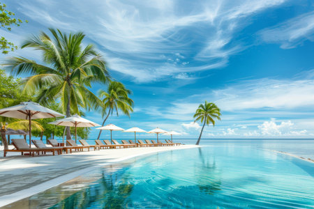 Luxurious beach resort with swimming pool and palm trees, outdoor tourism landscape