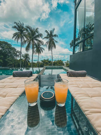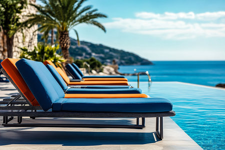 Luxury beach resort hotel swimming pool with leisure beach chairs, palm trees and blue sky