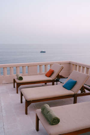 Wooden loungers near the pool at the villa by the sea, at sunset.