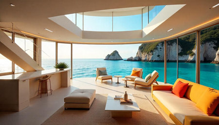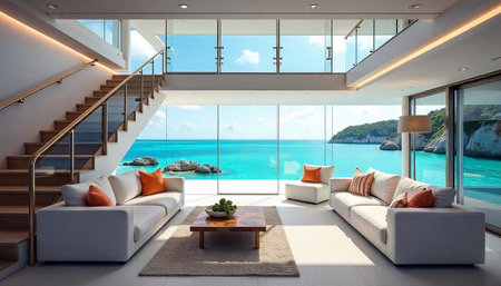 Luxurious coastal living room with panoramic ocean view