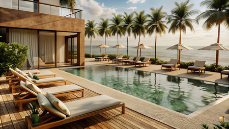 Luxurious beach resort with swimming pool, palm trees, and sea horizon in tropical paradise setting