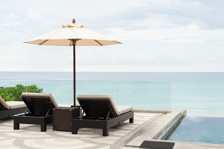 Umbrella and chair around swimming pool with sea ocean view for holiday vacation travel concept