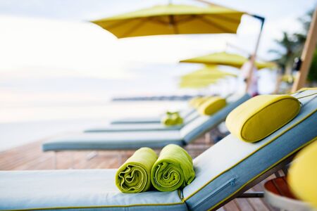 Rolled up towels on sunbeds by beautiful luxury swimming pool at hotel resort
