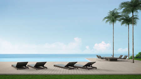 Sunbeds and dining table on wooden floor deck with infinity edge swimming pool.3d rendering