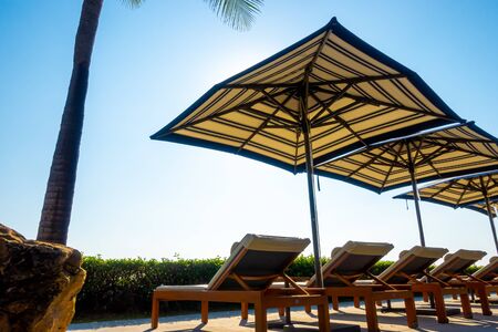 Umbrella and chair around outdoor swimming pool in hotel and resort with sunlight