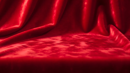 Close-up of luxurious red velvet fabric with smooth folds and soft lighting