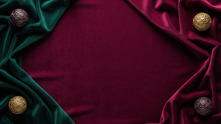 Rich burgundy and emerald green velvet fabrics are draped to create a frame, with decorative gold and bronze orbs in the corners.