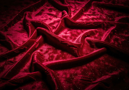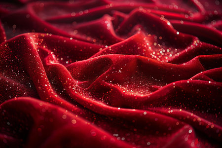 A close up view of luxurious deep crimson velvet fabric, elegantly crumpled with soft folds. shimmering glitter particles are scattered across the rich texture, creating a festive and opulent background.
