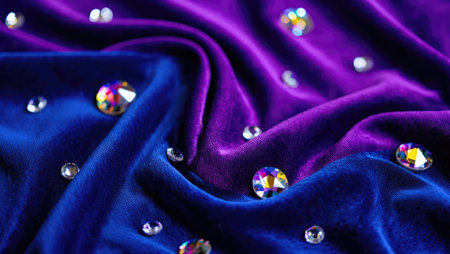 Soft fabric in deep purple and blue tones is artfully arranged with shiny gems scattered across, showing a beautiful blend of colors and textures ideal for design or styling projects.