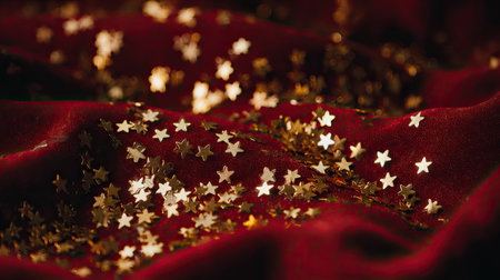 A stunning close-up image featuring golden star-shaped glitter scattered on rich red velvet fabric, creating a magical and elegant atmosphere. Perfect for festive decorations.