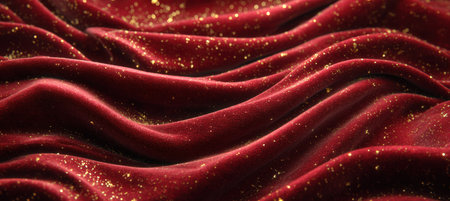 High-resolution close-up of red velvet fabric featuring subtle folds and golden sparkle dust. Captures a luxurious holiday texture with dramatic soft lighting for an elegant look.