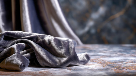 Close-up view of luxurious velvet fabric casually draped on a textured table against an artistic background, creating an elegant and stylish atmosphere.
