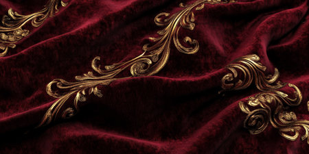 Opulent dark red velvet fabric with realistic texture, intricate golden embroidery details, rich and elegant luxury feel