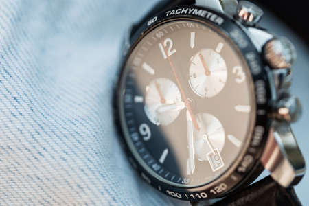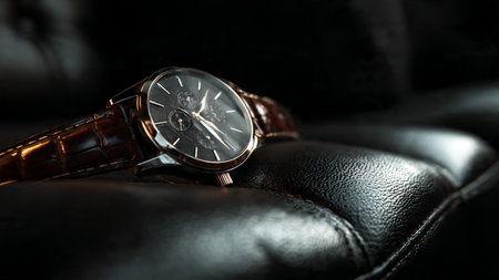 Closeup at luxury men wristwatch with black dial and leather strap.
