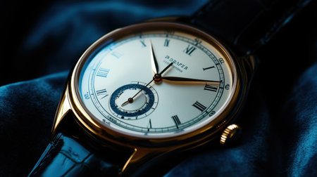 An elegant luxury wristwatch featuring Roman numerals and a blue subdial, perfectly placed on a dark velvet background, showcasing exceptional craftsmanship.