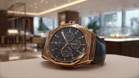 A luxurious gold watch with a black face sits on a marble counter in a high-end store