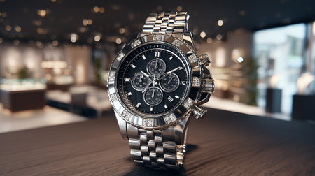 A luxurious silver watch with diamonds on a wooden table in a modern store