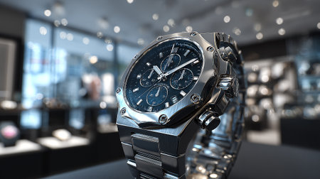 A luxurious silver watch with a black face displayed in a high-end jewelry store
