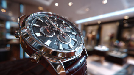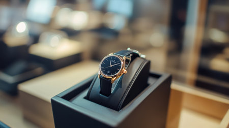 A luxurious watch with a black face and leather strap on display in a high-end store