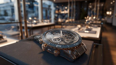 A luxurious watch on display in a high-end jewelry store with various accessories
