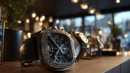 A luxurious watch with a diamond-encrusted bezel on a wooden table in a modern room