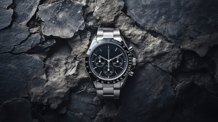 A sleek black chronograph watch sits prominently on a rough slate surface, showcasing its elegant design and craftsmanship. The intricate details stand out against the textured backdrop