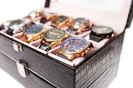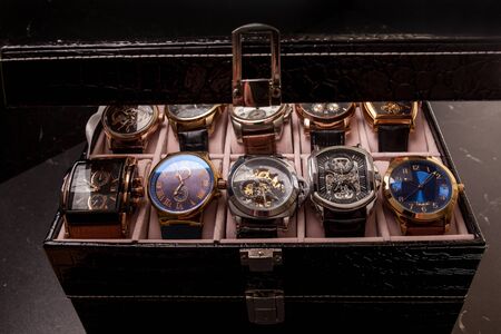 2021-06-01 Various Collection of Wrist Watches in the Watches Box on the Wood Table in Bangkok, Thailand.