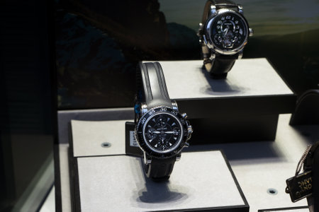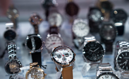 Mulhouse - France - 2 January 2021 - Closeup of watches by Mont blanc the famous luxury brand on accessories in a jewelry showroom