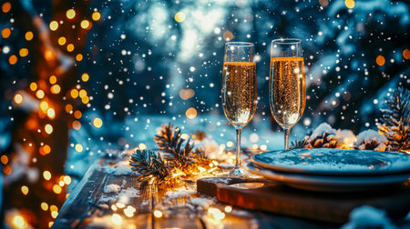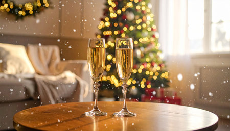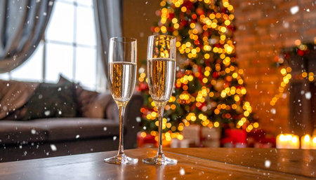 Elegant champagne flutes filled with bubbly sit atop a decorated winter table, set for joyful festivities and warm holiday moments.