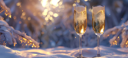 Two champagne glasses adorned with a golden ribbon, surrounded by snow and glowing bokeh lights, creating a luxurious and festive holiday setting.