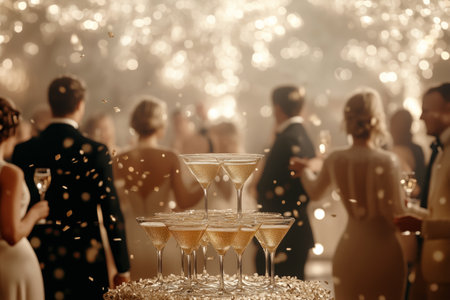 A glamorous champagne tower at a lively celebration, with guests mingling in a sparkling atmosphere.