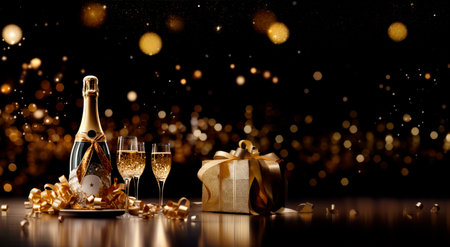 Champagne bottle on black background with champagne glasses and gift boxes. Sparkling lights and bokeh on backdrop.
