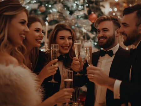 A group of stylishly dressed, diverse friends in formal wear are toasting with champagne glasses at an elegant party. A decorated Christmas tree and warm lights are in the background as confetti falls, suggesting a New Year's Eve or holiday celebration.