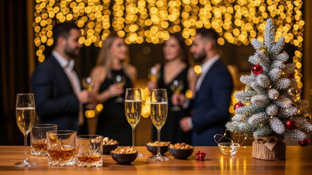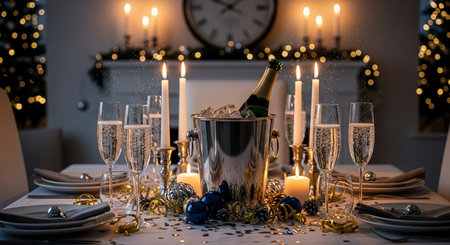Capture the magic of a New Year's Eve celebration with this elegant party setup featuring sparkling glasses, festive decor, and a cozy atmosphere.
