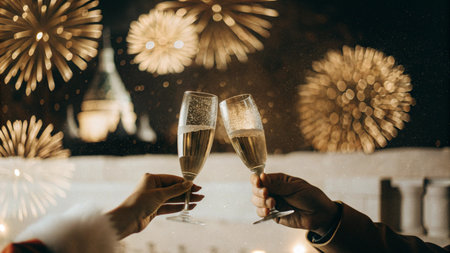 Guests to gather to celebrate New Year's Eve, clinking champagne glasses as vibrant fireworks illuminate the dark night sky. The atmosphere is filled with joy and anticipation as the countdown begins, creating a festive backdrop for the celebration.