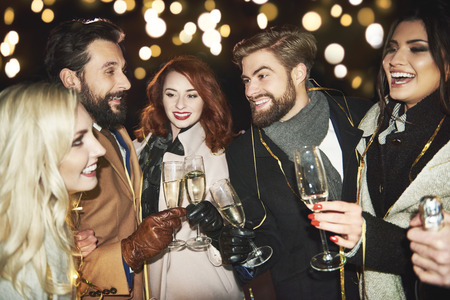 Conception of new year. Photo of the company of friends having the party with alcohol.