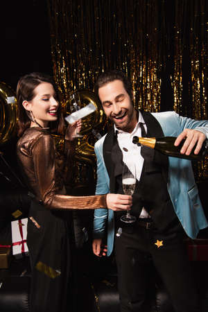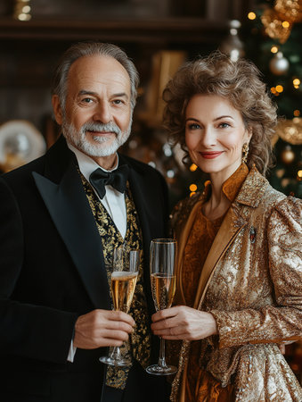 A man and woman dressed in festive attire toast with glasses of champagne. They are surrounded by shiny golden tinsel, celebrating a party or holiday like New Years Eve.