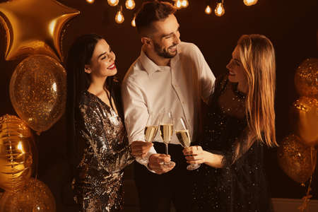 Happy friends with glasses of sparkling wine celebrating New Year indoors