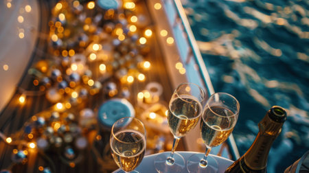 Two champagne glasses surrounded by holiday decorations, with bokeh lights and a festive atmosphere in the background, perfect for celebrating the season.