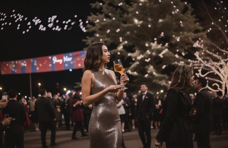 A beautiful young woman in an elegant dress dances with friends amidst sparkling champagne glasses and twinkling Christmas lights, capturing the magic of holiday celebrations