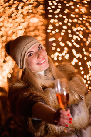 Girl wearing winter hat with glass of champagne at party over holiday glowing gold background.