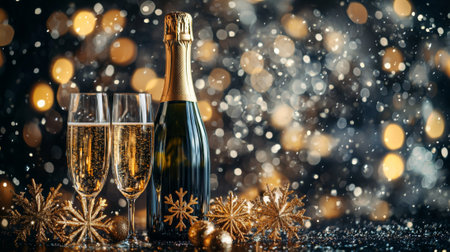 Two elegant glasses are filled with sparkling champagne beside a beautifully decorated bottle, all set against a glittering background, perfect for welcoming a joyous celebration.