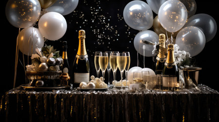A Lavish New Year's Eve Celebration Table Setting, Adorned with Elegant Glassware, Sparkling Decorations and Festive Party Favors