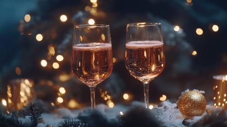 Two elegant glasses filled with sparkling drinks sit among festive decorations and soft lights. This image captures the essence of celebration and warmth during the holiday season, perfect for festive themes.
