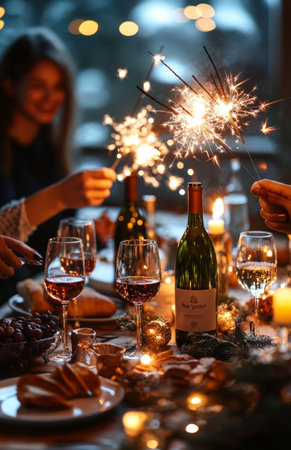 Happy friends enjoy a festive New Year's dinner party with sparklers, wine, and snowy atmosphere