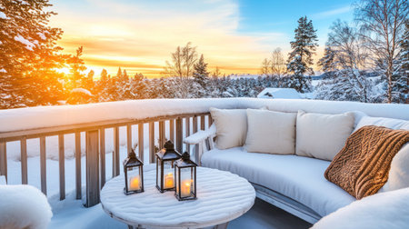 A Scandinavian-style balcony with white wooden furniture, covered in snow and adorned with soft cushions, features a small table with lanterns and a cozy blanket, bathed in the golden glow of sunset. The scene captures an atmosphere perfect for relaxation or social gatherings during winter. --chaos 30 --ar 16:9 --v 6.1 Job ID: b00e15b3-4ee3-41fa-9347-44bb41a09ef9